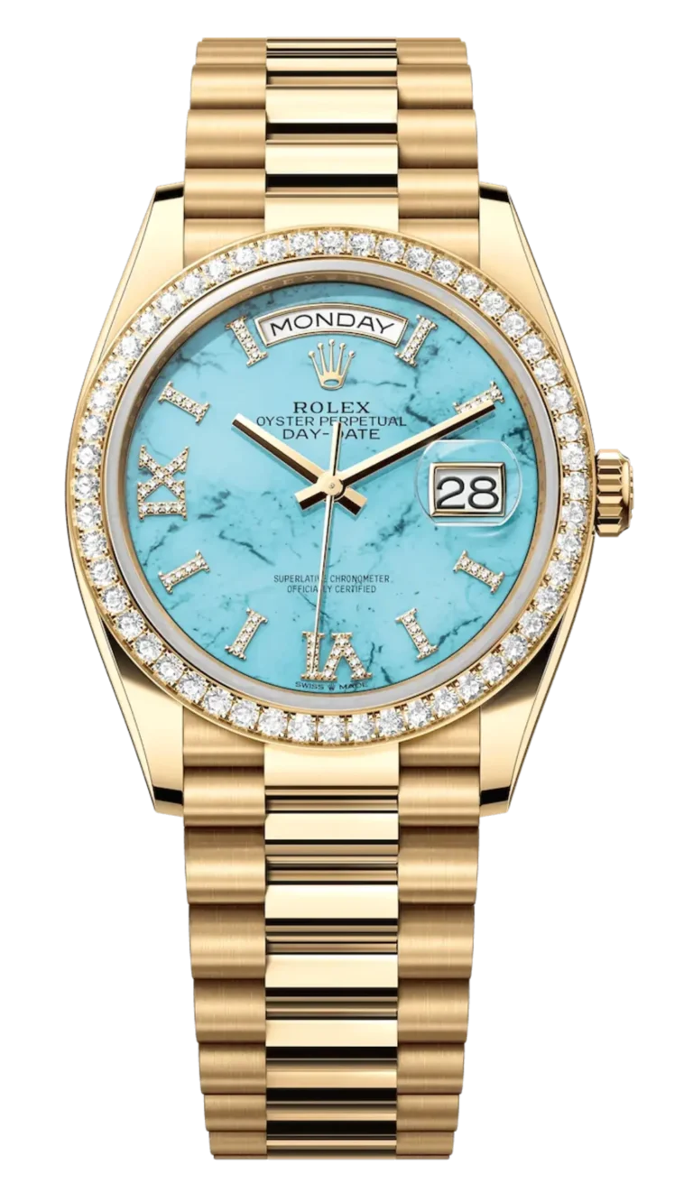 Rolex Day-Date 128348RBR Yellow Gold Diamond Bezel Turquoise Diamond Dial