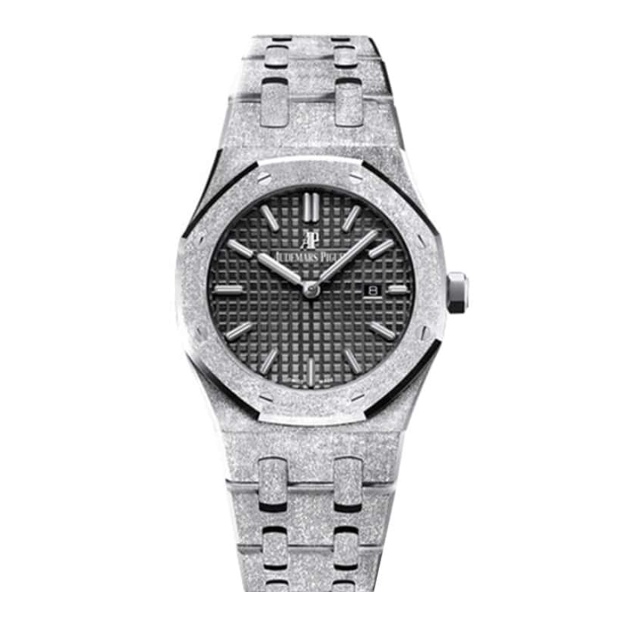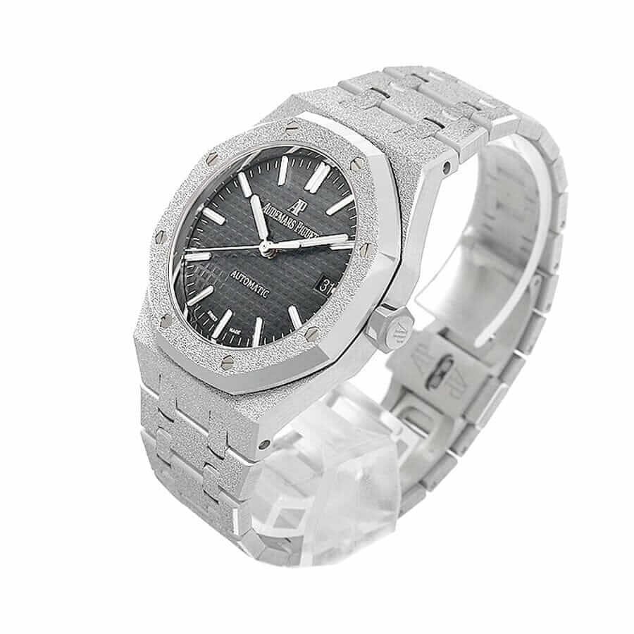 The Frosted AP Replica features a 41mm stainless steel case that exudes strength and durability. making it a reliable companion for any occasion. The stainless steel strap in a sleek silver color adds a touch of sophistication. perfectly complementing the dark grey dial. Designed to withstand the elements. this timepiece is waterproof. ensuring peace of mind even in adverse conditions.