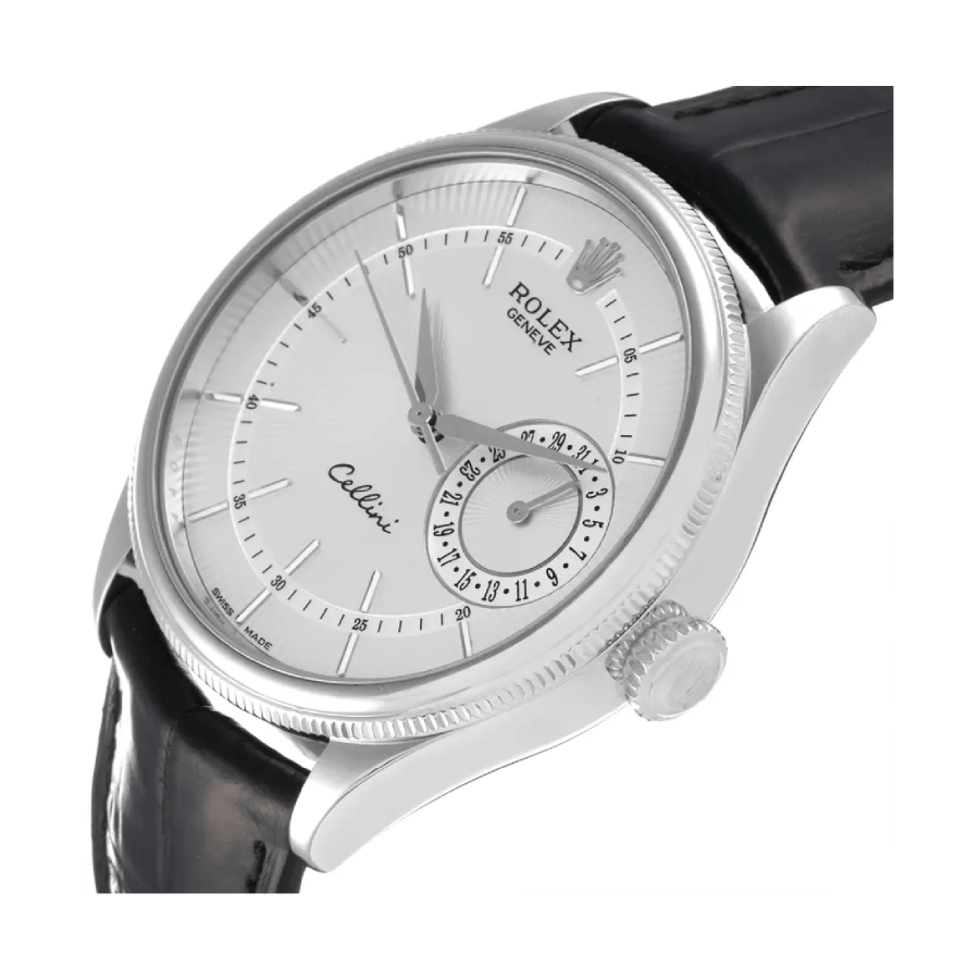 This Rolex Cellini M50519 White Dial Black Leather New Replica is a high-quality timepiece. It features a 904L stainless steel case and bezel in a sleek polished finish. The 39.00 mm case has a thickness of 12.00 mm and is fitted with a scratch-resistant sapphire crystal for durability and clarity. The black leather strap is adjustable and includes a 904L stainless steel fold clasp for a secure fit.