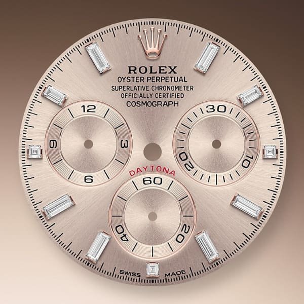 Unworn Rolex Cosmograph Daytona 40mm 18k Everose Gold Sport Chronograph watch. Solid, polished finished, 18kt Everose Gold case. The original is equipped with a new sunburst glossy Sundust dial. The sunburst finish creates subtle reflections of light, making this model even more expressive. Superb?8 baguette-cut diamonds act as hour markers. At the same time, smaller diamonds are set at 3, 6, and 9 o’clock positions. The dial has small Sundust counters. Polished Everose Gold hands, hour and minute hands with luminous fill. Fine printed minute/seconds and fractions of a second track. Polished 18kt Everose Gold screw-down crown with Rolex’s patented “Triplock” triple waterproofness system, ensuring that the crown screws down against the Oyster case as securely as a submarine hatch. Screw-down Chrono buttons in polished 18kt Everose Gold. Chronograph/Stopwatch function: large central seconds counter hand, able to measure time up to 1/8th of a second; 30-minute counter sub-dial located at the 3 o’clock position; 12-hour counter sub-dial located at the 9 o’clock position. Continuous running small seconds hand sub-dial located at the 6 o’clock position. A scratch-resistant sapphire crystal protects the dial. Monobloc middle case, screw-down case back. Fixed 18ct Everose Gold bezel with filled engraved tachymeter scale. The movement is mechanical self-winding, Rolex in-house caliber 4130 with 44 jewels and 72 hours of power reserve running the time only or 66 hours with the chronograph function running. The watch is presented on an 18k Everose Gold Oyster bracelet of flat three-piece links with a folding Oysterlock safety clasp with an Easylink 5 mm comfort extension link. The water resistance is up to 100m/330ft. The Watch comes complete with store papers and a Rolex box. Will include 3 years Store Warranty.