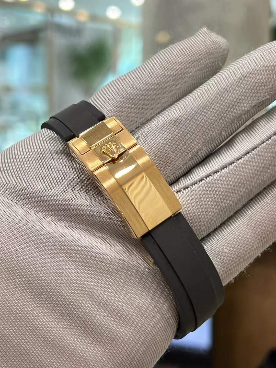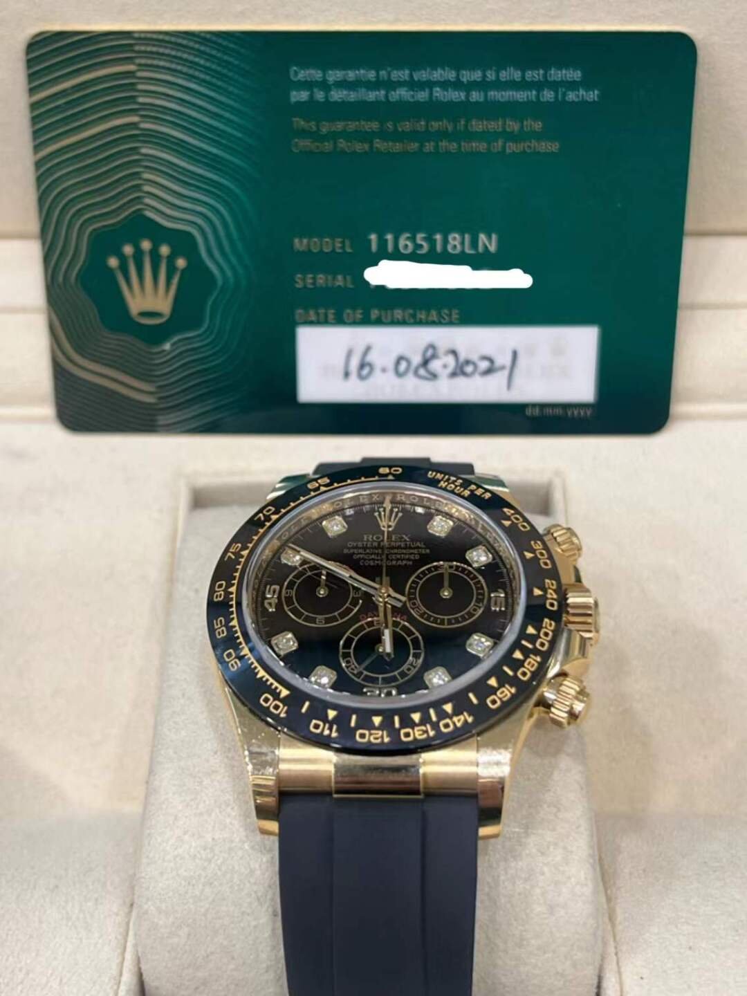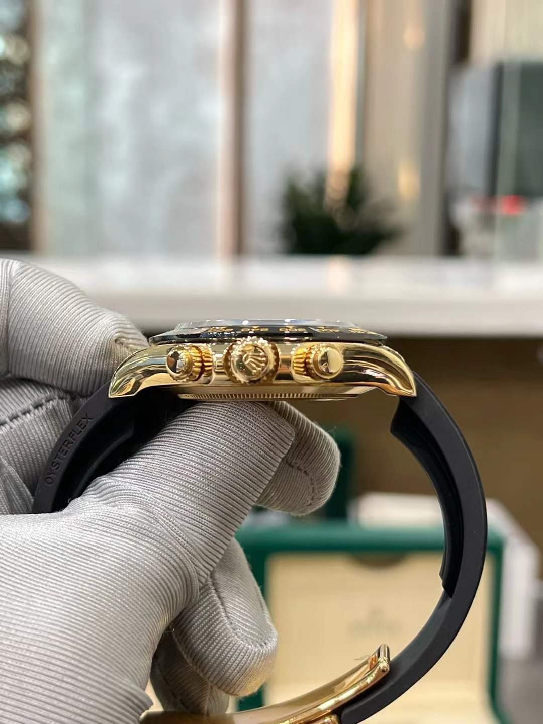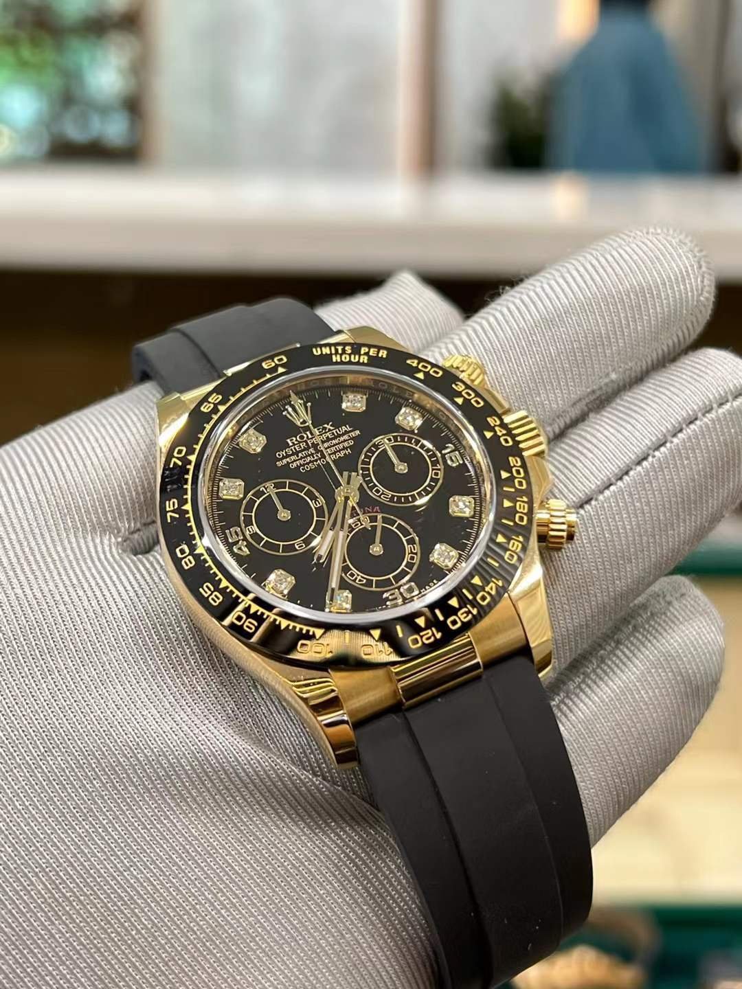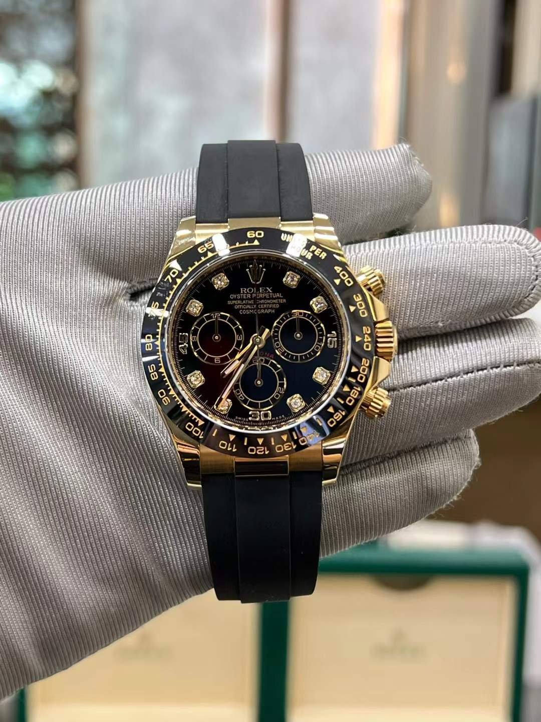 Rolex Cosmograph Daytona 116518LN men???s watch. Features a polished with brushed solid 18k yellow gold case and black elastomer Oysterflex bracelet. Black Cerachrom insert ceramic fixed bezel with engraved 60 minute scale and graduations. Black dial with luminescent hands and diamond hour markers. Chronograph with large central chronograph seconds hand, 30 minute counter sub-dial at 3 o???clock and 12 hour counter sub-dial at 9 o???clock. Small seconds sub-dial at 6 o???clock. Stop-seconds feature for precise time setting. Powered by the Rolex Caliber 4130 self-winding automatic COSC Superlative Chronometer certified movement which boasts a 72 hour power reserve. A scratch resistant sapphire crystal protects the dial. The case is round and 40mm in diameter. Solid case back. Screw down crown with Triplock triple waterproofness system. Screw down case back. Folding Oysterclasp deployment buckle with Easylink 5mm comfort extension link. Waterproof to 100 meters / 330 feet. Functions: hours, minutes, small seconds, chronograph. Luxury watch style. Swiss made.