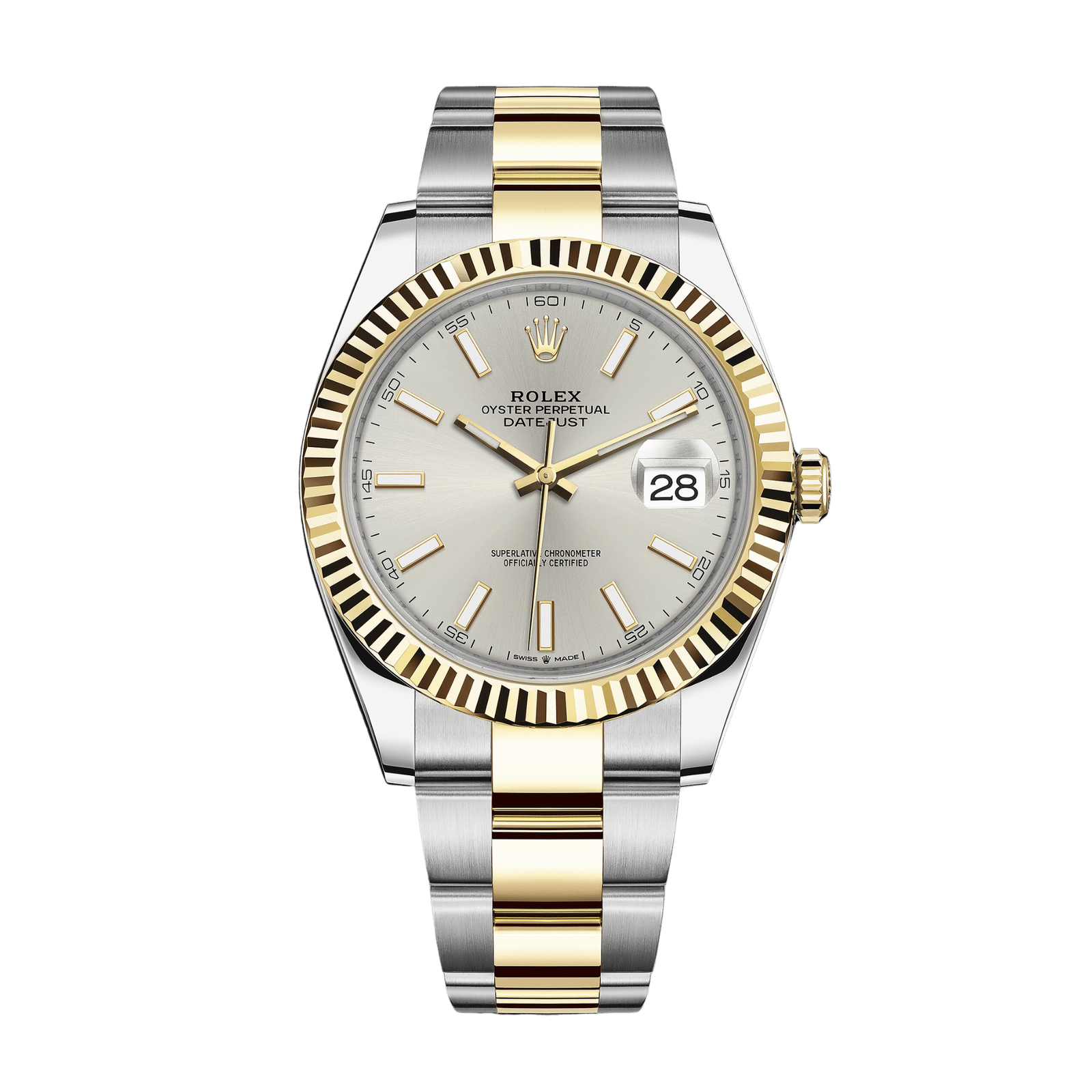 41mm Yellow Rolesor case with 904L steel monobloc middle case, screw-down steel back, 18K yellow gold screw-down crown, 18K yellow gold fluted bezel, scratch-resistant double anti-reflective sapphire crystal with cyclops lens over the date, silver dial, index hour markers, Rolex caliber 3235 perpetual self-winding movement with date at 3 o’clock that changes instantaneously at midnight in a few thousandths of a second, approximately 70 hours of power reserve, yellow Rolesor Oyster bracelet made from a combination of 904L steel and 18K yellow gold with three-piece links, folding Oysterclasp buckle with Easylink 5mm comfort extension link. Waterproof to 100 meters.