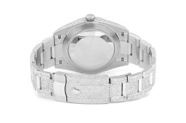 This silver-colored Rolex DateJust iced out watch has a 41mm case and 23.50ctw of Moissanite diamonds. This watch has received in-depth maintenance to the exacting standards of Rolex by our skilled watchmakers. The Rolex box for this watch is included.