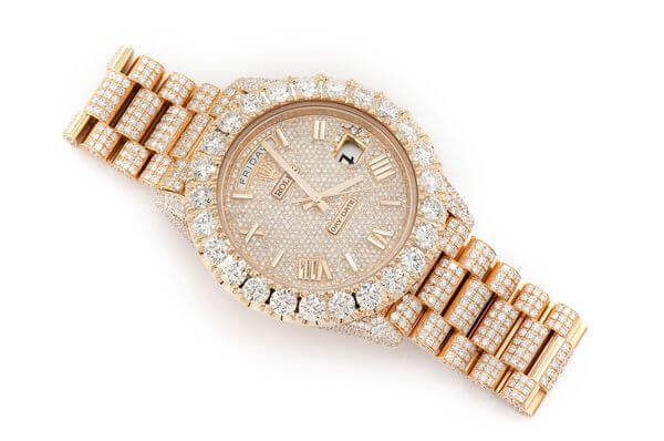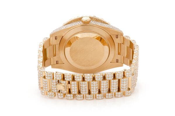 This Rolex Day-Date is made of Yellow and has a 40mm case size with 23.00ctw of Moissanite diamonds. Our expert watchmakers have serviced this watch inside and out to Rolex quality standards. This watch comes with an Rolex box.
