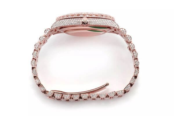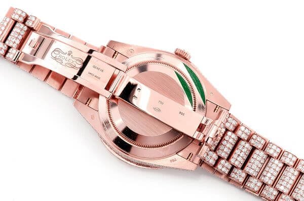 This Rolex?Day-Date is made of Rose Gold and has Roman Dial a 40mm case size with 24.00ctw of Moissanite diamonds. Our expert watchmakers have serviced this watch inside and out to Rolex quality standards. This watch comes with an Rolex box.