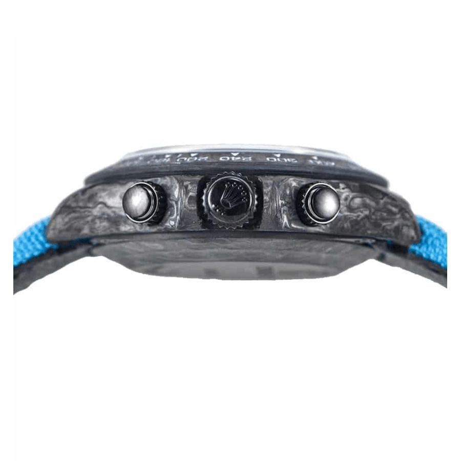 Crafted with a 904L stainless steel case featuring a forged carbon color. this 40.00 mm timepiece boasts robustness and a commanding presence on the wrist. The sapphire crystal ensures that the dial remains scratch-free and clear. giving the watch an everlasting pristine look. The fabric bracelet. adjustable to fit any wrist comfortably. is secured with a 904L stainless steel pin buckle clasp. harmoniously blending blue and black hues. adding an athletic yet sophisticated elegance.