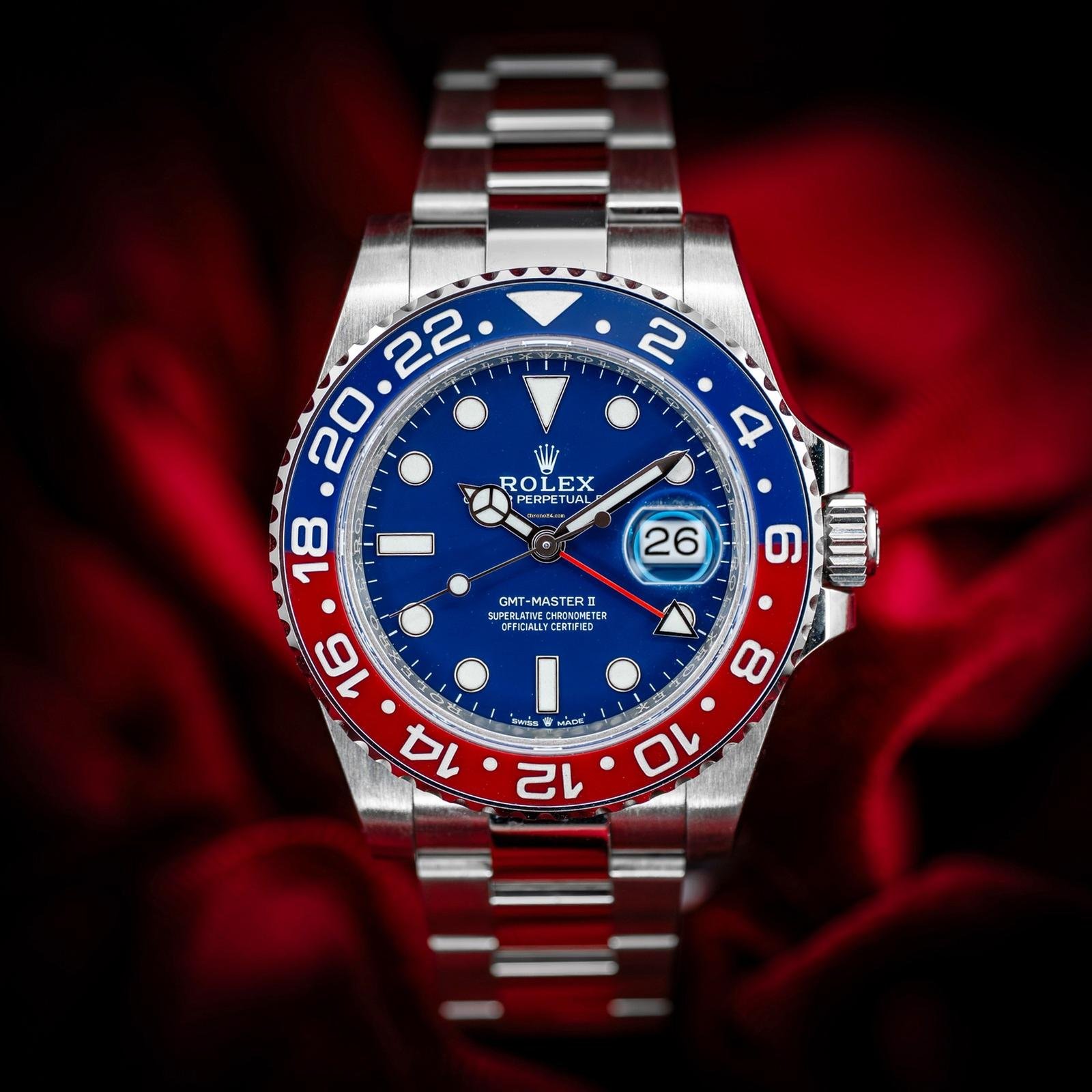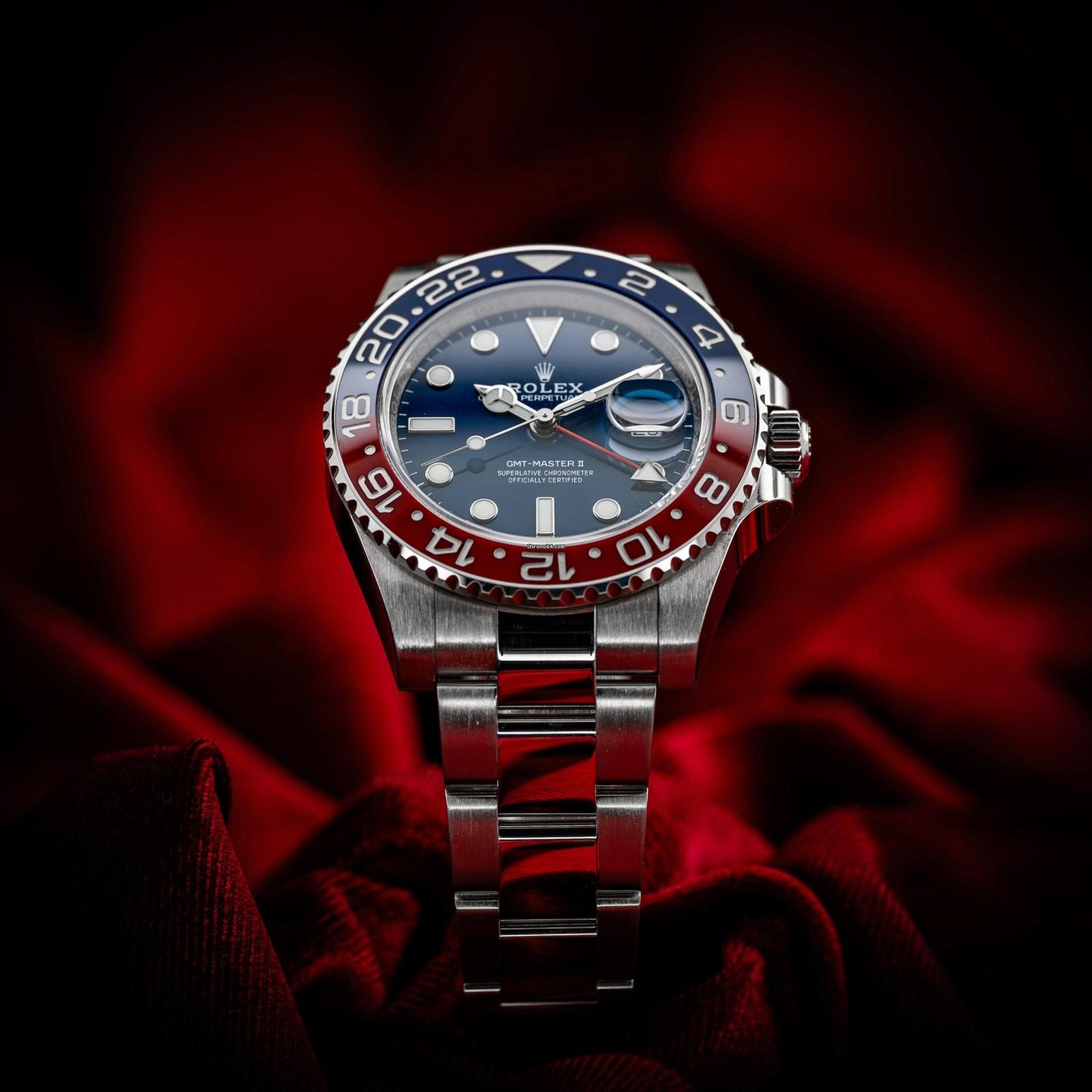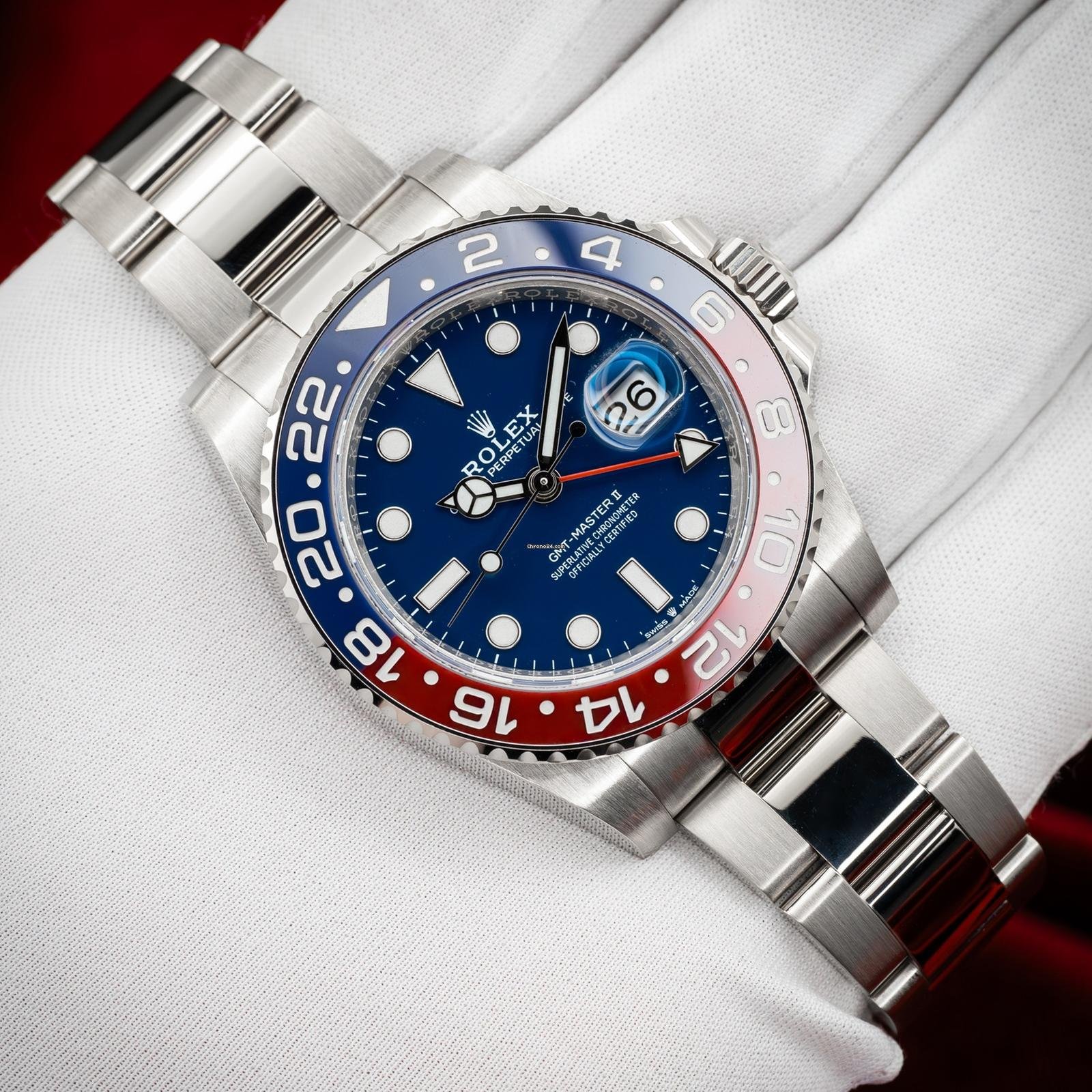 In addition to conventional hour, minute and seconds hands, the GMT-Master II features an arrow-tipped hand, which circles the dial once every 24 hours, as well as a bidirectional rotatable 24-hour graduated bezel.