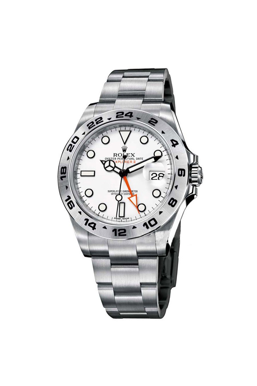 This Oyster Perpetual Explorer II in Oystersteel with an Oyster bracelet features a white dial with an arrow-shaped 24-hour hand and hour markers with a Chromalight display.